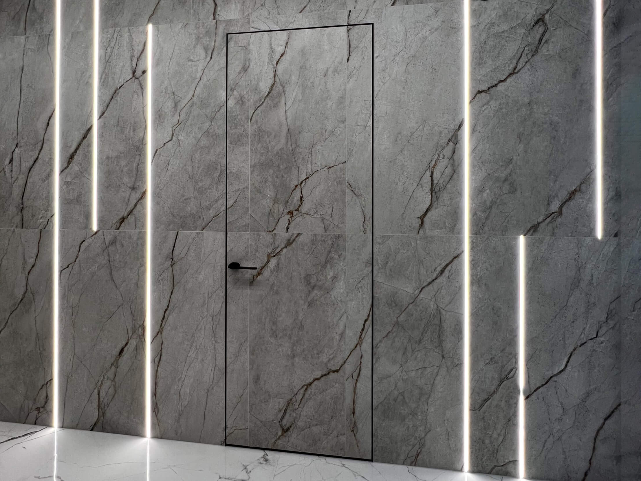 Для облицовки дверей скрытого монтажа плиткой большей толщины необходима слаженная работа наших мастеров по установке дверей и мастеров по укладке плитки. Они должны подогнать края плитки так, чтобы она легла в пазы алюминиевых профилей. Обычно такая работа выполняется на профессиональном оборудовании для резки плитки и не может быть выполнена кустарным способом.