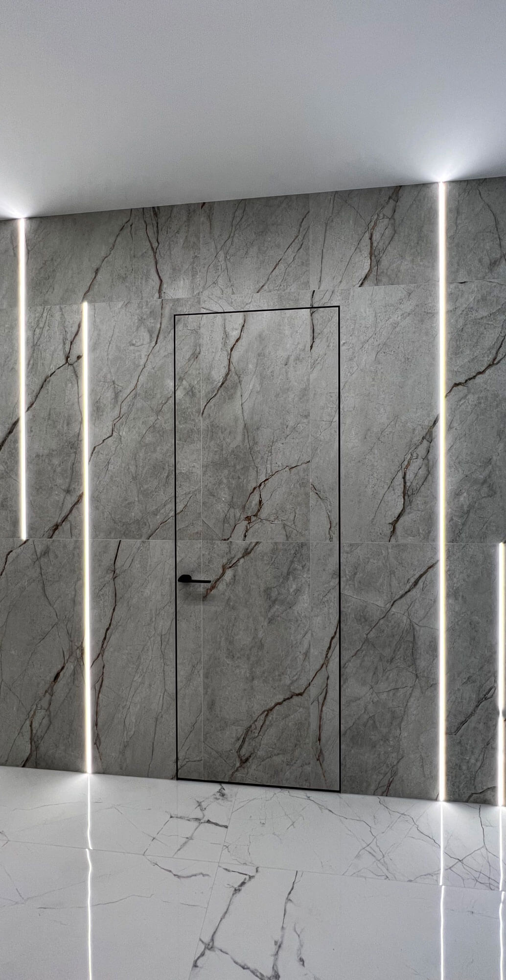 Когда возникает необходимость интеграции двери-невидимки (скрытые двери) в помещение, облицованное керамической плиткой — например, в ванной комнате — оптимальным решением становится облицовка поверхности самой конструкции этой же плиткой. Это позволяет добиться визуального единства со стеной, а также обеспечить высокую влагостойкость. При этом двери-невидимки (скрытые двери) могут быть оформлены в едином стиле с интерьером — за счёт цвета рамы, коробки и фурнитуры — что придаёт конструкции современный и эстетичный вид.